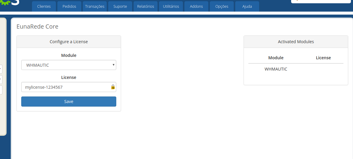 After activating the module, configure the license through the EunaRede Core Module. Go to Addons -> EunaRede Core, select WHMAUTIC in the drop-down menu and insert your license key.