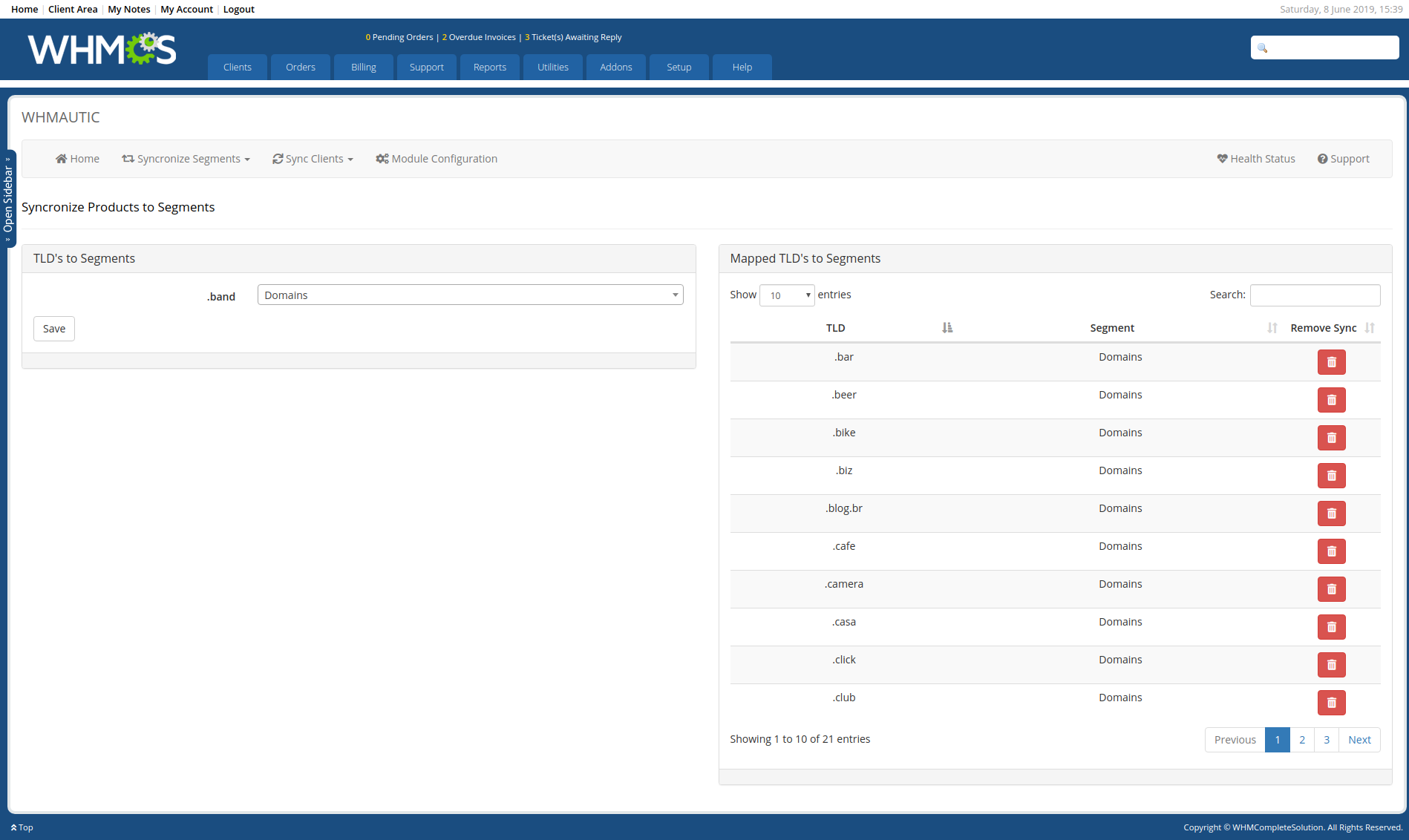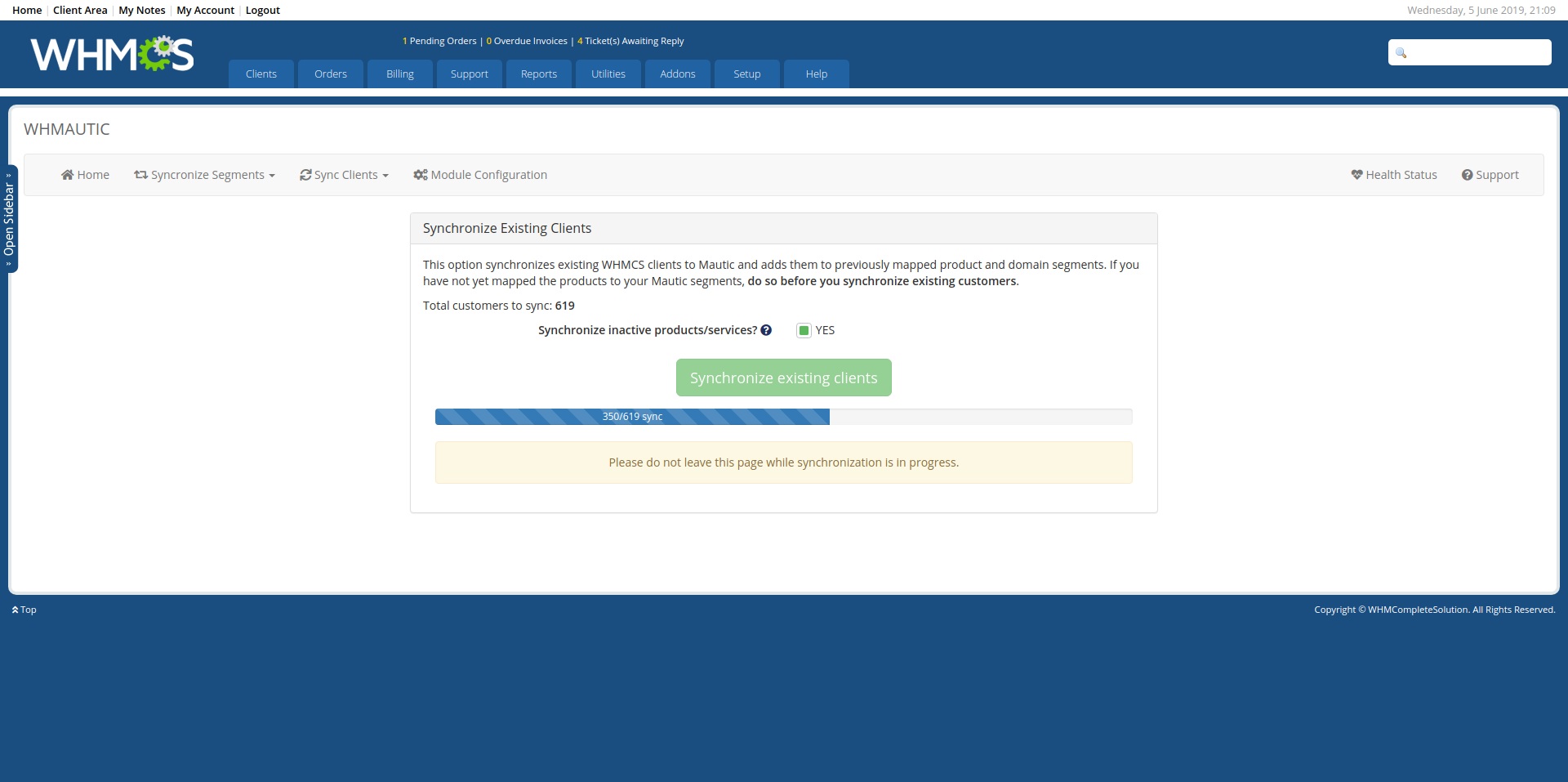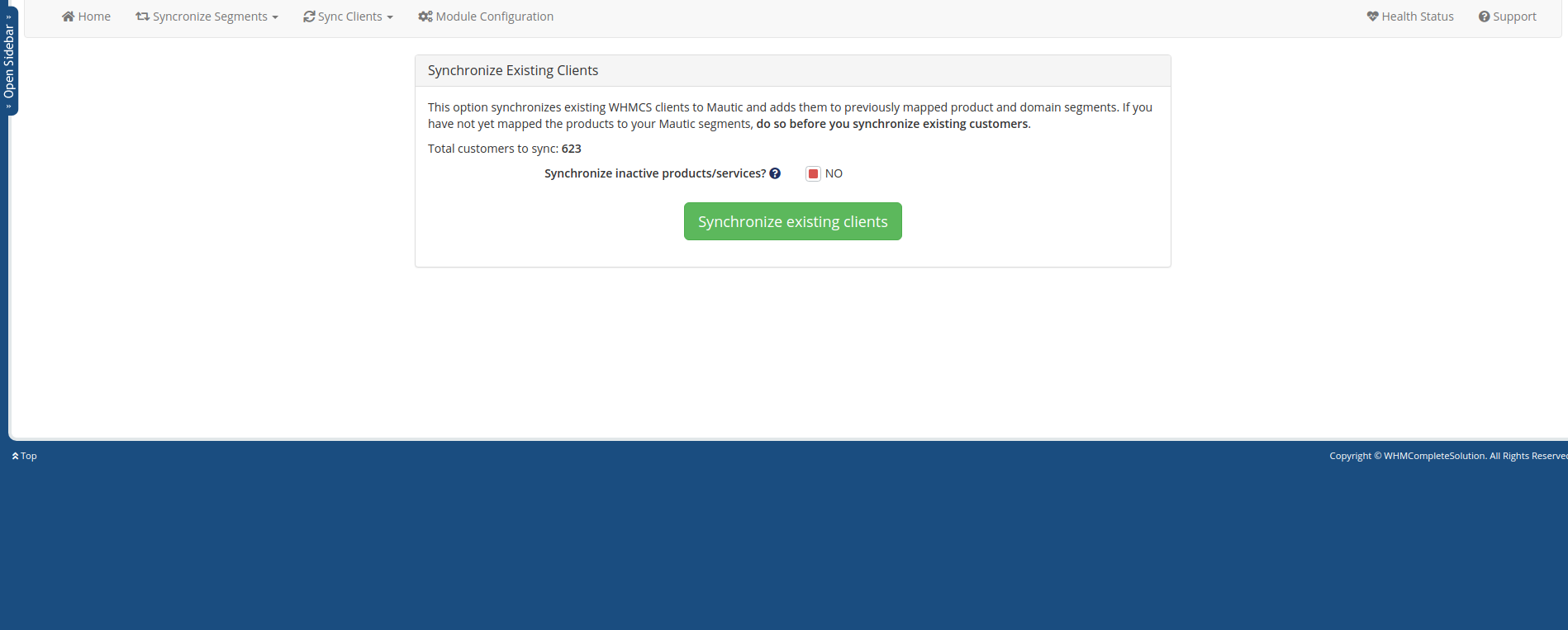 This feature synchronizes existing WHMCS clients to Mautic and adds them to previously mapped product and domain segments. If you have not yet mapped the products to your Mautic segments, do it before you synchronize existing customers.